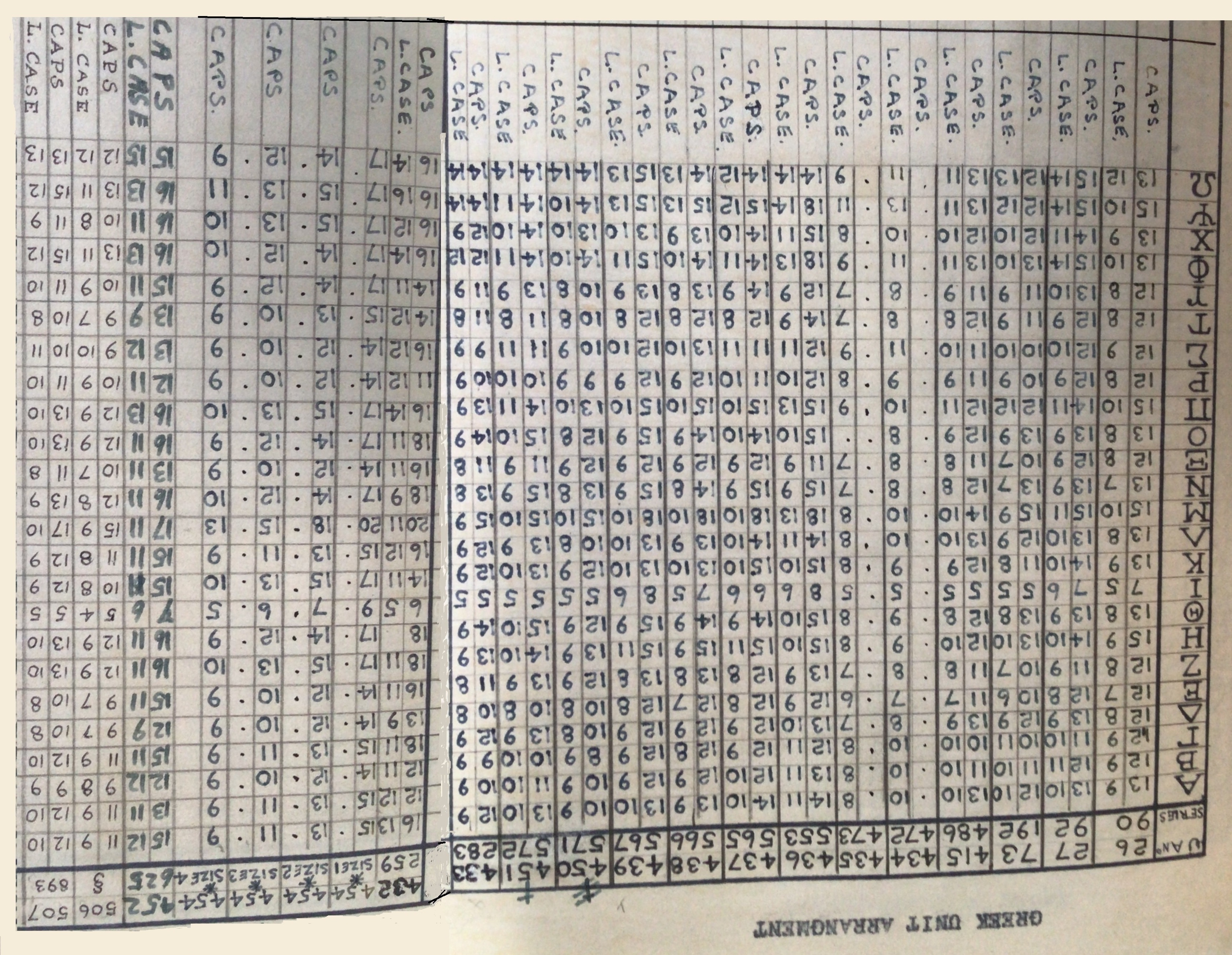 The top line gives the UA (unit arrangement) serial number, and the second line the typeface series number. Then in each row, the columns give the upper case (caps) units, then the lower case units, of the named letter. Punctuation and figures are not shown. For composition, each row in the diecase that holds the matrices corresponds to a given unit value that is matched by the stopbar case and the wedge. For display, the physical width of a given letter can be calculated from the set and point size of the typeface. The typeface set widths are not shown here, but knowing that Monotype's base unit is 0.166÷18, i.e. 0.0007685″ then for example, Greek Upright series 90 in 10pt is 9¾ set which makes one unit of it to be 0.0007685″×9¾ i.e. 0.00749″. As series 90's UA is 26, the table gives the letter A as 13 units, so its width is 13×0.00749″, i.e. 0.0974″.