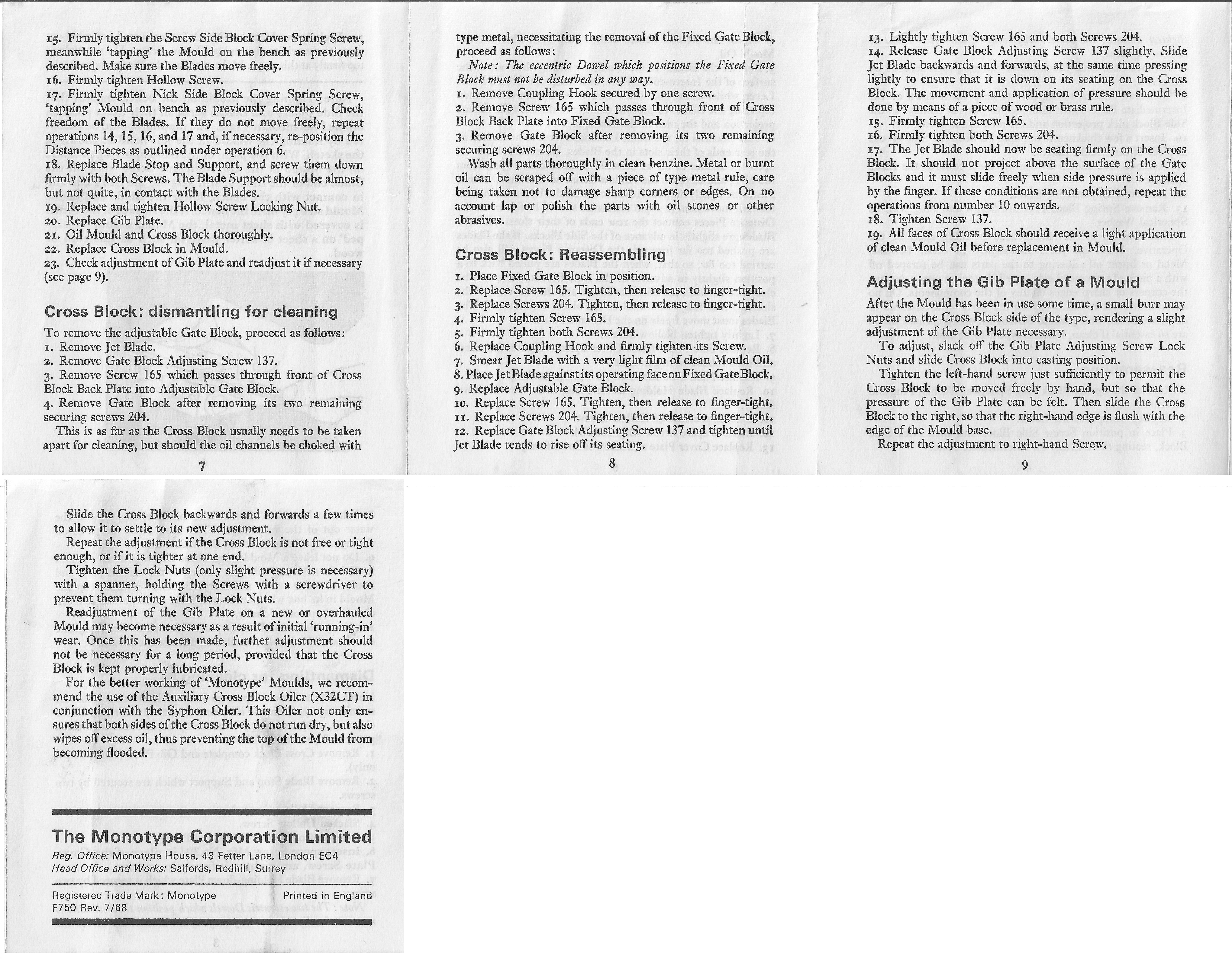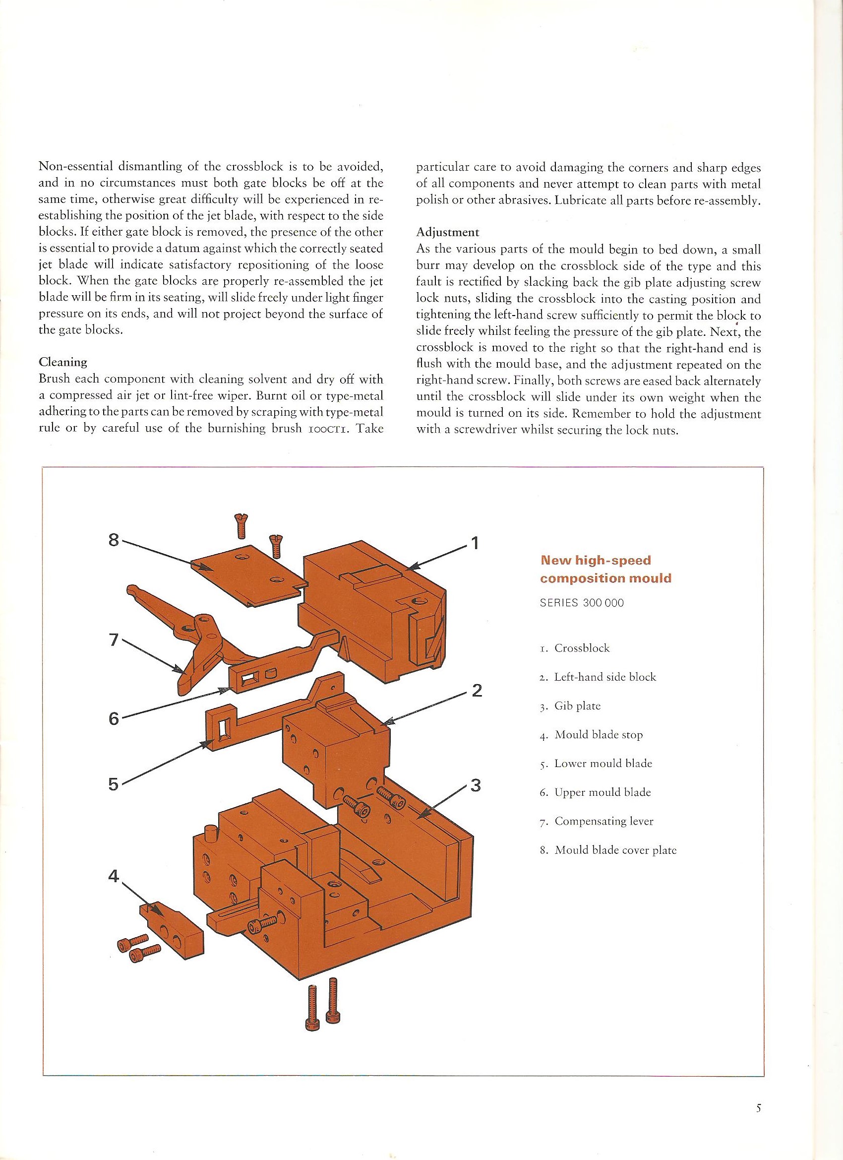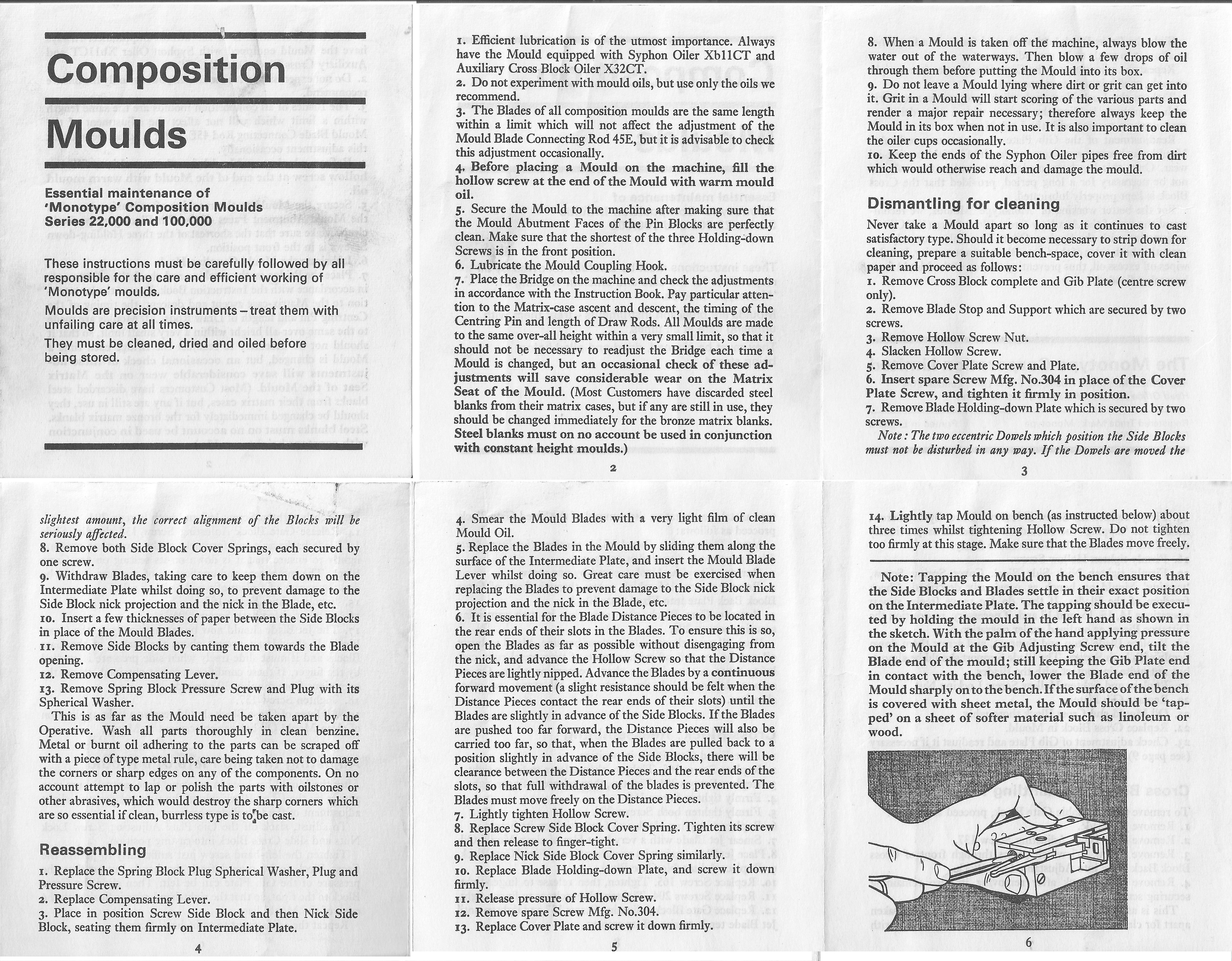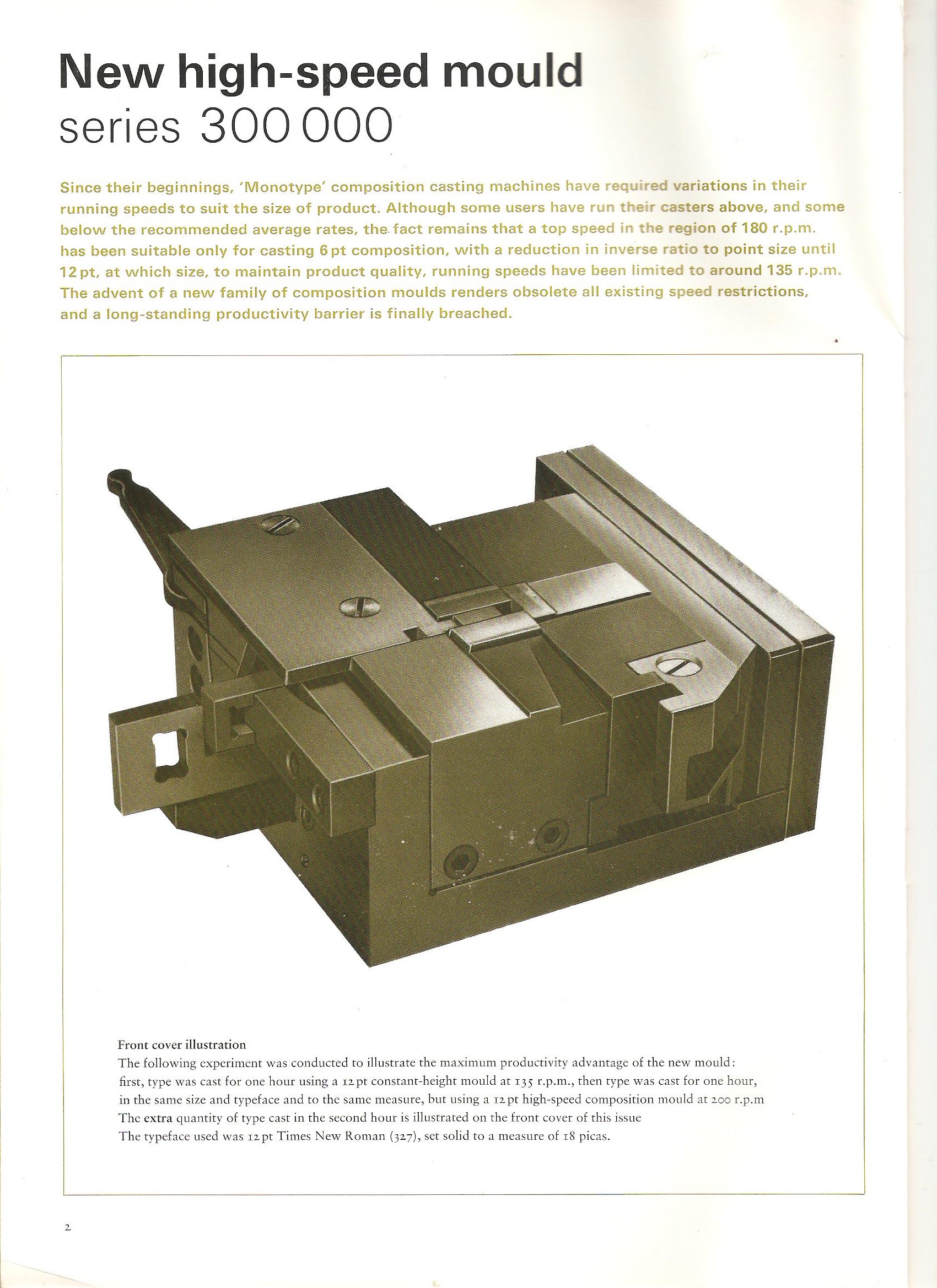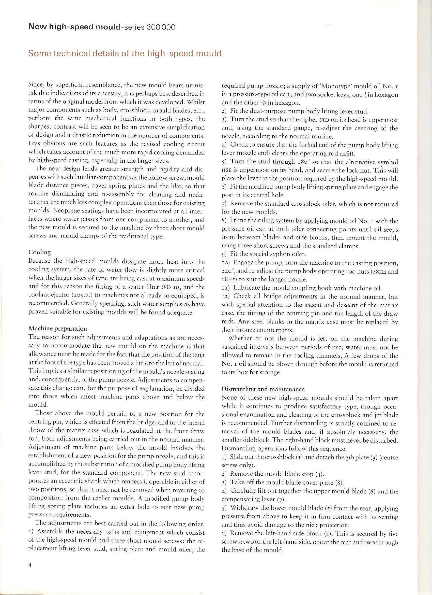 The Monotype Corporation issued a small instruction leaflet when providing their moulds. Often these get discarded, so here are two of the leaflets. Note that these relate to moulds made by the Monotype Corporation in the UK, and not Lanston Monotype in the USA, although general principles will probably be the same. Also below is a four page extract from Monotype Bulletin 83 (March 1971) describing the high speed mould.