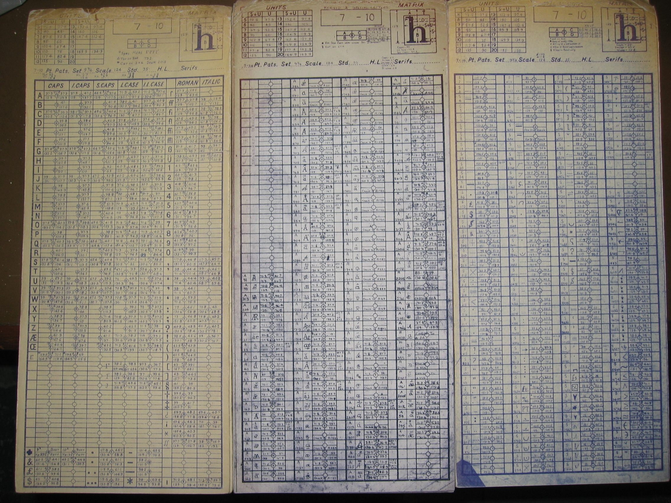 Held in two formats, one the Unit Arrangments of ‘Monotype’ Composition Matrices booklet (as on the Metal Type website), the other single type series charts for a given typeface.