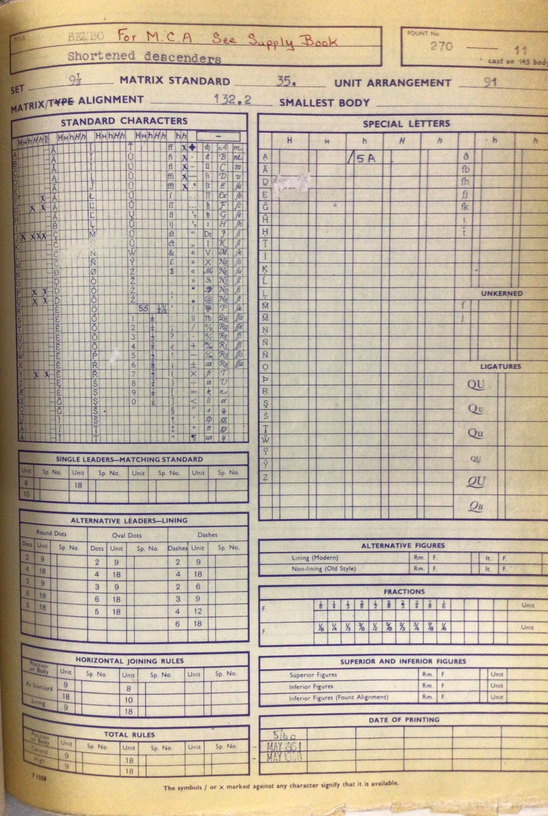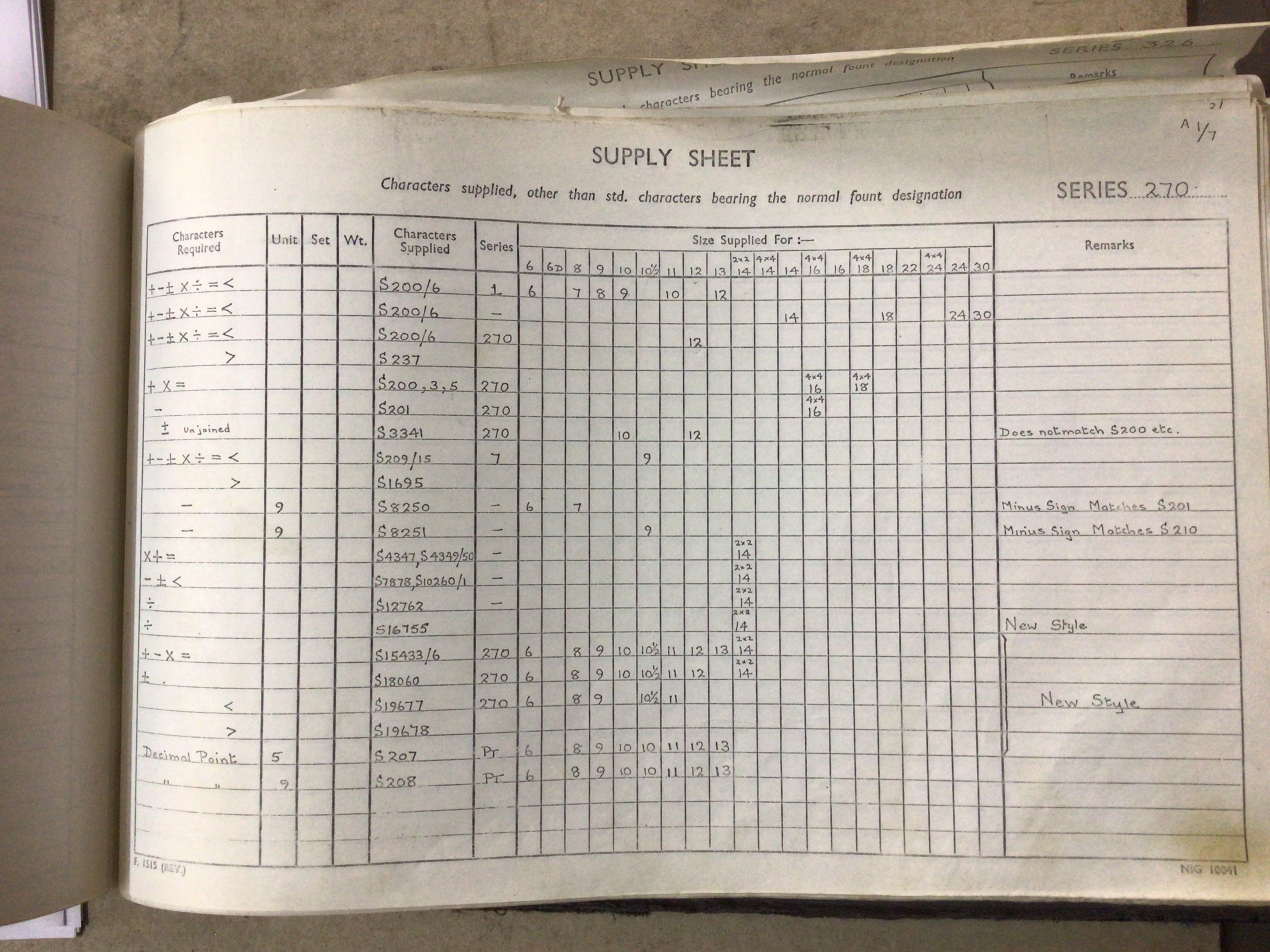 The following are some of the important paper records held at the Type Archive in London, that relate to the production and subsequent use of matrices for the many typefaces issued by the Monotype Corporation.